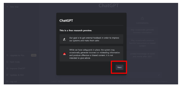 모든 가입 절차가 완료되었습니다!! 그리고 쳇지피티로 들어가면 작은 창이 하나 뜨는데요. 이때 빨간색으로 표시된