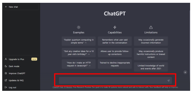 밑에 화면은 쳇지피티에 로그인을 하고 첫 화면입니다. 빨간색으로 표기된 부분에 쳇지피티에게 원하는 내용을