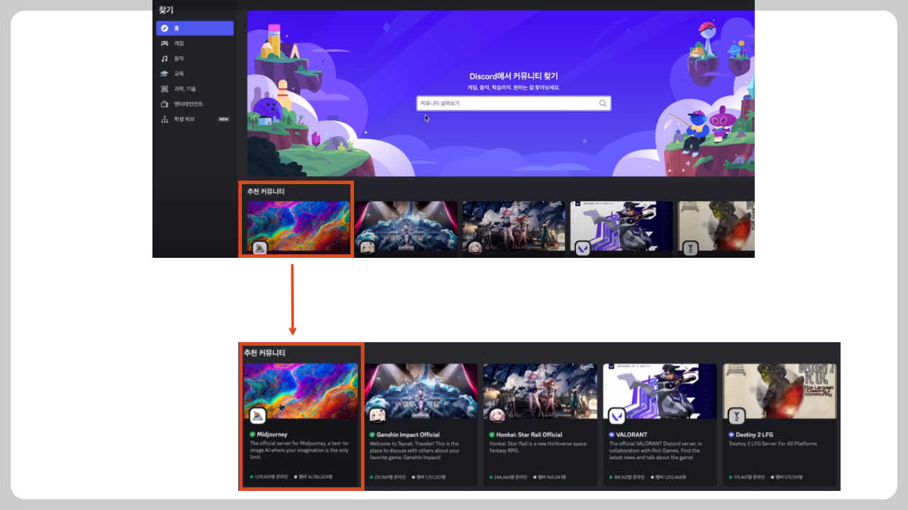 그리고 홈화면에서 추천 커뮤니티에서 미드저니를 클릭합니다. 그럼 아래와 같이 미드저니 인증화면에서 인증을 하시면 됩니다.