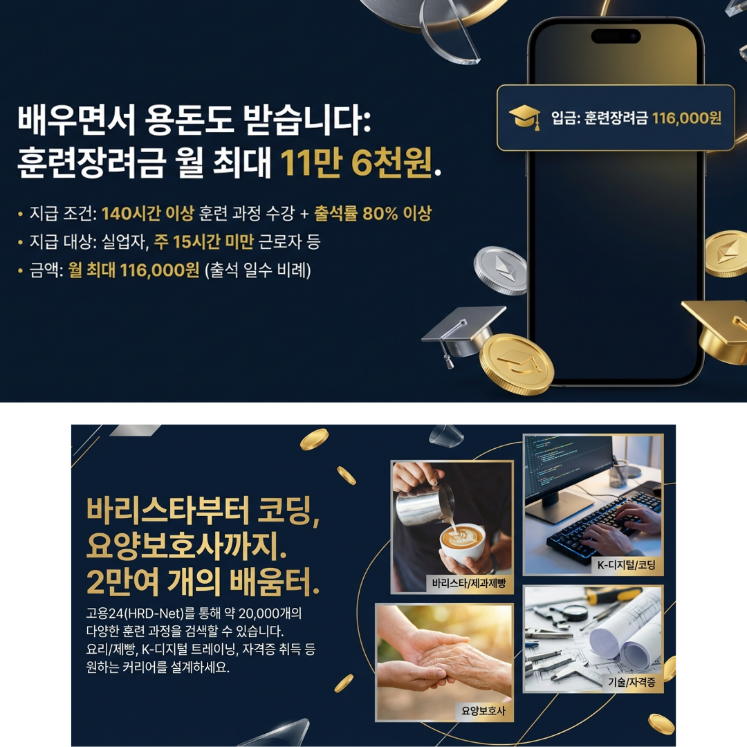 복잡한 서류 없이 '고용24' https://www.work24.go.kr/cm/main.do 홈페이지에서 온라인으로 바로 신청할 수 있으니 더 이상 미루지 마세요! 여러분의 두 번째 전성기, 국가 지원금으로 똑똑하게 시작해 보시길 바랍니다.
