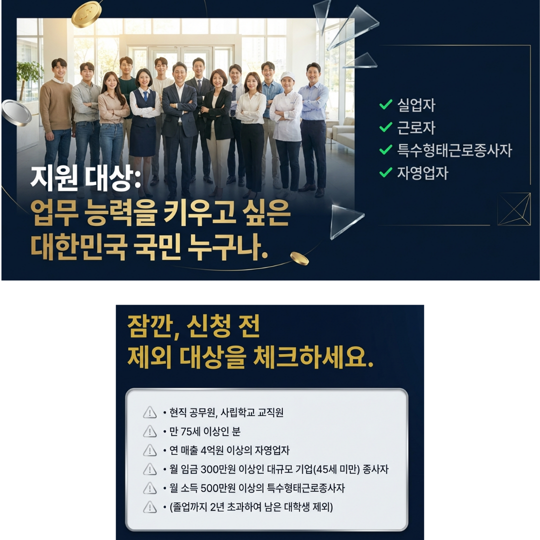 실업자만 대상이라고 생각하셨다면 오해예요! 대한민국 국민이라면 누구나 업무 능력을 키우기 위해 신청할 수 있습니다. 현재 회사를 다니고 있는 재직자는 물론, 자영업자와 프리랜서(특고)분들도 모두 포함됩니다. 다만, 현직 공무원이나 사립학교 교직원, 연 매출 4억 원 이상의 자영업자 등 일부 제외 대상이 있으니 신청 전 꼭 확인해 보세요!